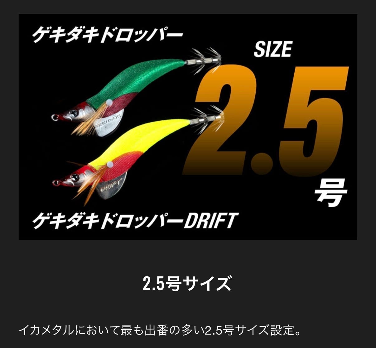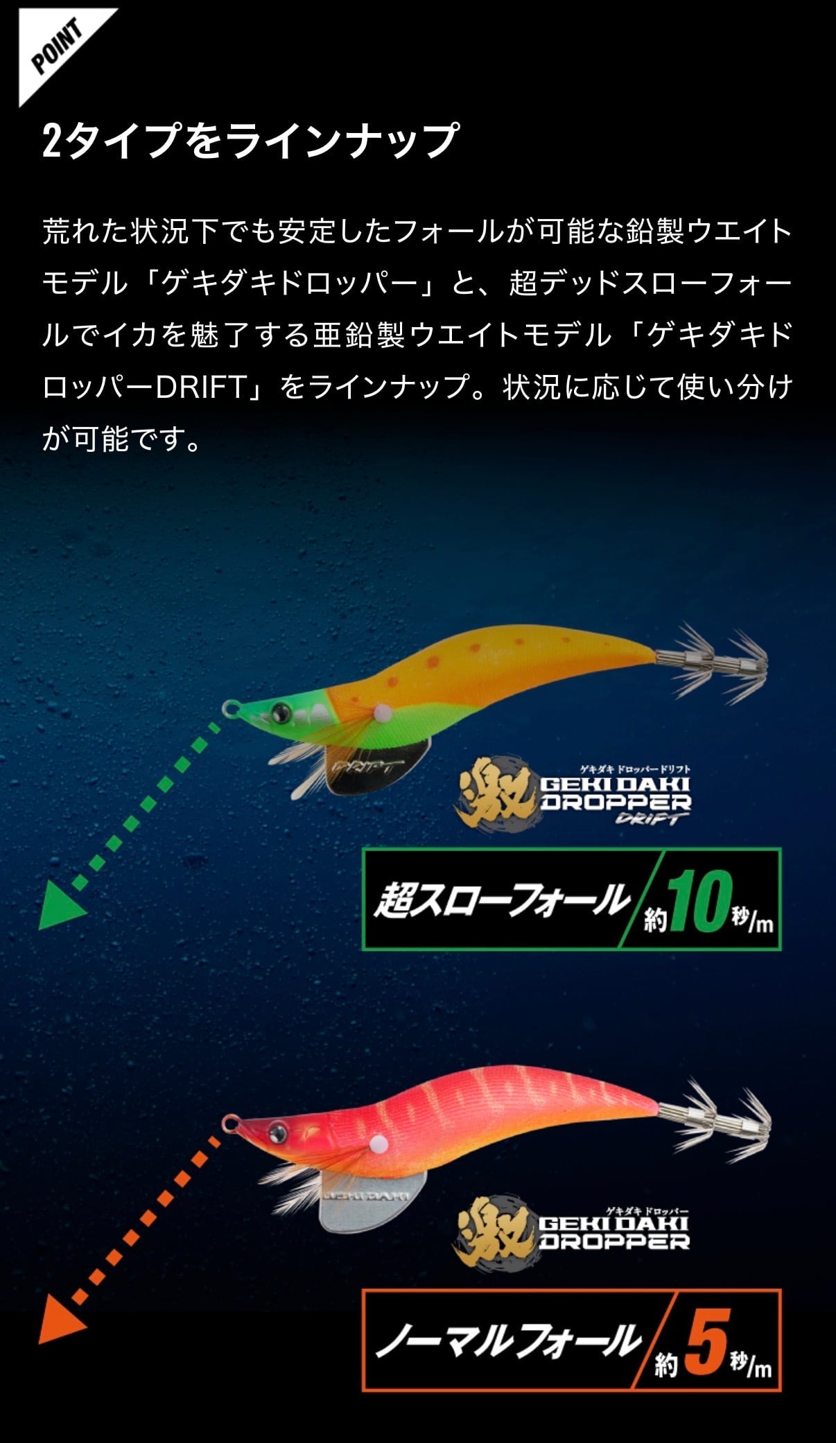 荒れた状況下でも安定したフォールが可能な鉛製ウエイトモデル「ゲキダキドロッパー」と、超デッドスローフォールでイカを魅了する亜鉛製ウエイトモデル「ゲキダキドロッパーDRIFT」をラインナップ。状況に応じて使い分けが可能です。